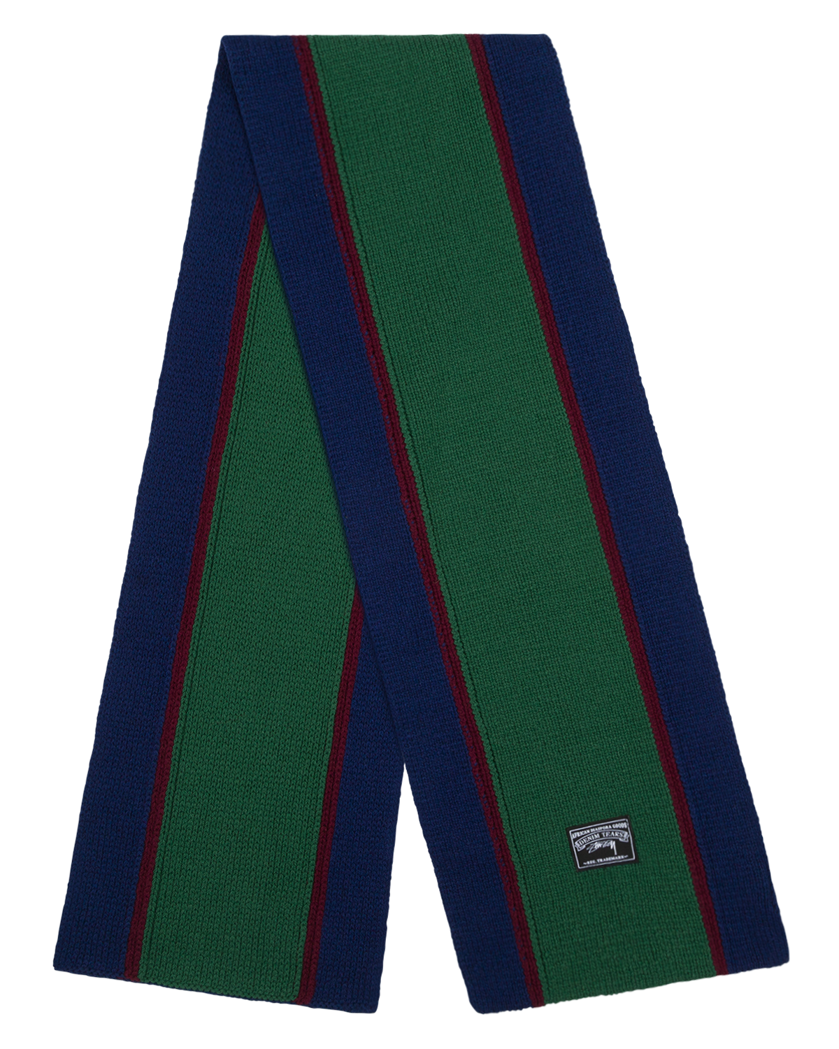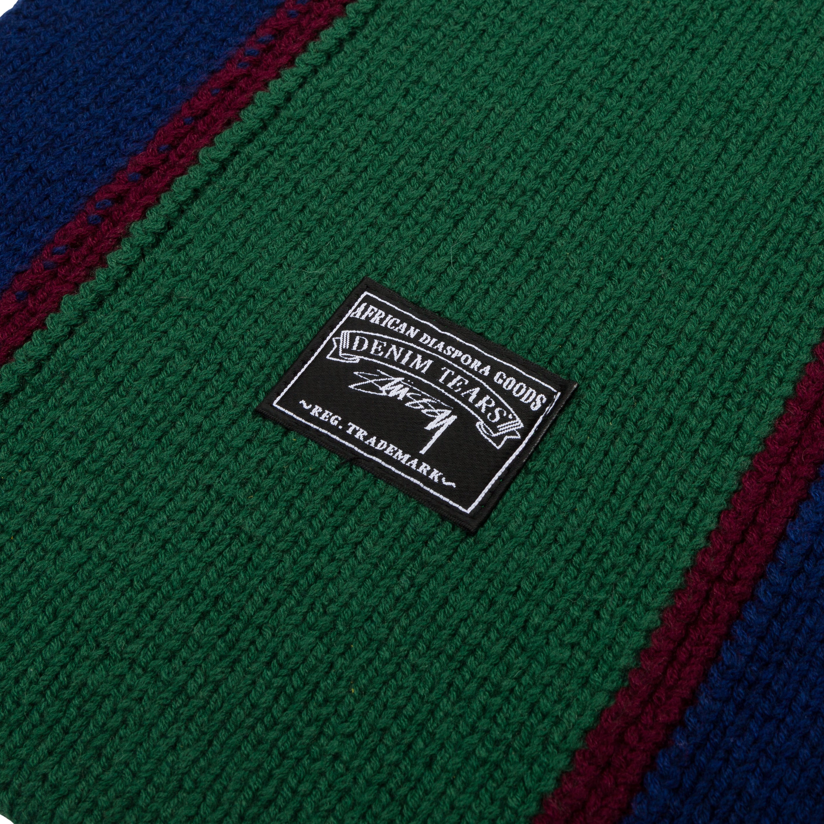 Knitted scarf in an extra fine merino wool and cotton blend, with a yarn-dyed striped jacquard pattern. Stüssy & Denim Tears co-branded label stitched at the edge.